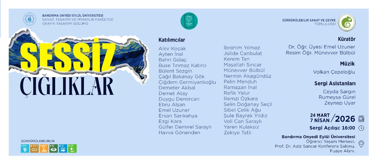 Bandırma Onyedi Eylül Üniversitesi Sanat, Tasarım ve Mimarlık Fakültesi Grafik Tasarımı Bölümü tarafından düzenlenen “Sessiz Çığlıklar” başlıklı karma sergi, sanatın ifade gücünü disiplinlerarası bir yaklaşımla ele alan nitelikli bir kültür-sanat etkinliği olarak kurgulanmıştır. Serginin küratörlüğü, aynı fakültede görev yapan Dr. Öğr. Üyesi Emel Uzuner ile Resim Öğretmeni Münevver Bülbül tarafından üstlenilmiştir. Bandırma Sanat Grubu üyeleri, akademisyenler, sanatçılar ve resim öğretmenlerinin katılımıyla gerçekleştirilen sergi, 24 Mart – 07 Nisan 2026 tarihleri arasında sanatseverlerle buluşmaktadır. Etkinlik, Sürdürülebilir Sanat Topluluğu organizasyonu ile hayata geçirilmiştir.