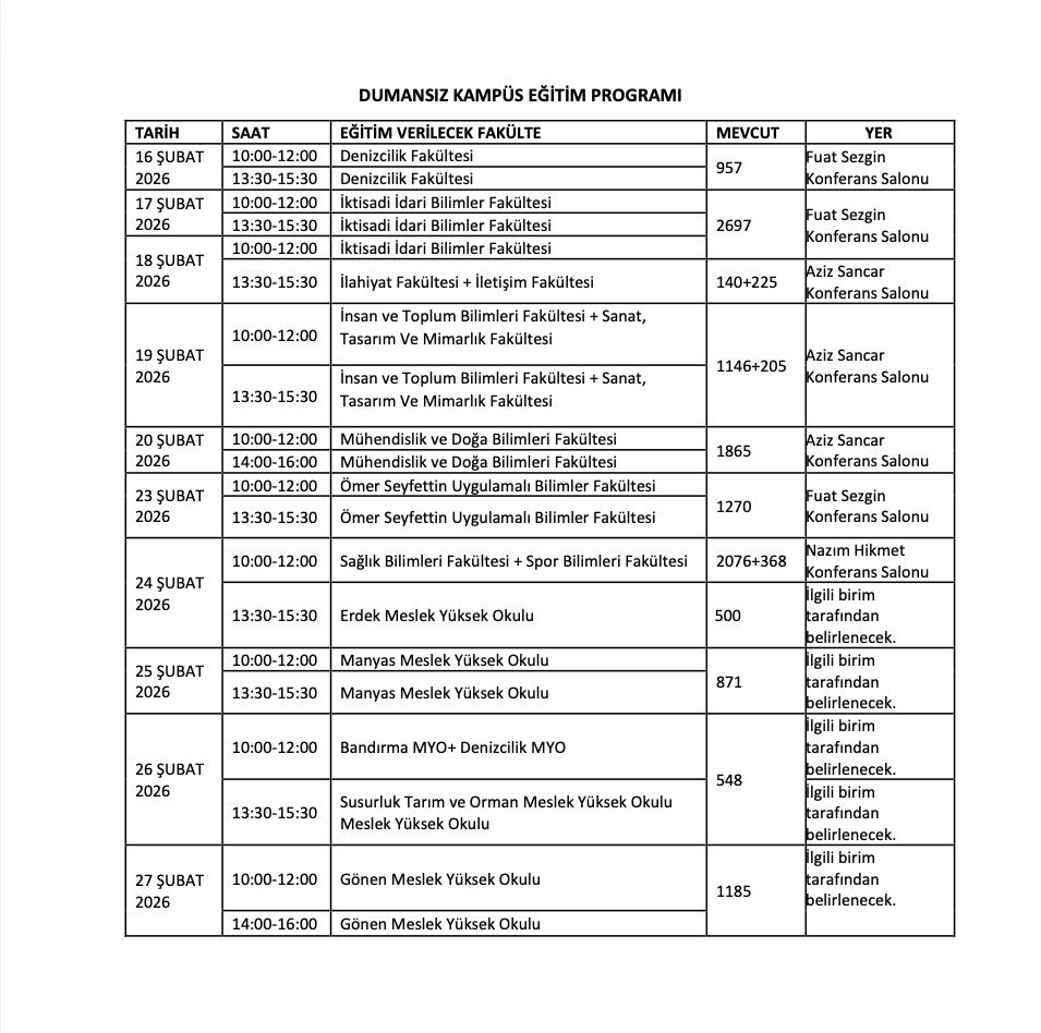 Tütün kullanımının, sağlık, davranışsal ve toplumsal boyutlarını kanıta dayalı bir yaklaşımla ele alarak, Dumansız Kampüs uygulaması ile tütün ürünlerinden korunma ve kullanımı bırakma yöntemleri hakkında farkındalığı geliştirmek amacıyla 16-27 Şubat 2026 tarihleri arasında 10 gün boyunca günde iki oturum olmak üzere "Dumansız Kampüs Eğitimi" yapılacak olup, ilgili eğitime ekte sunulan program çerçevesinde Üniversitemiz tüm öğrencilerinin katılımı zorunludur.