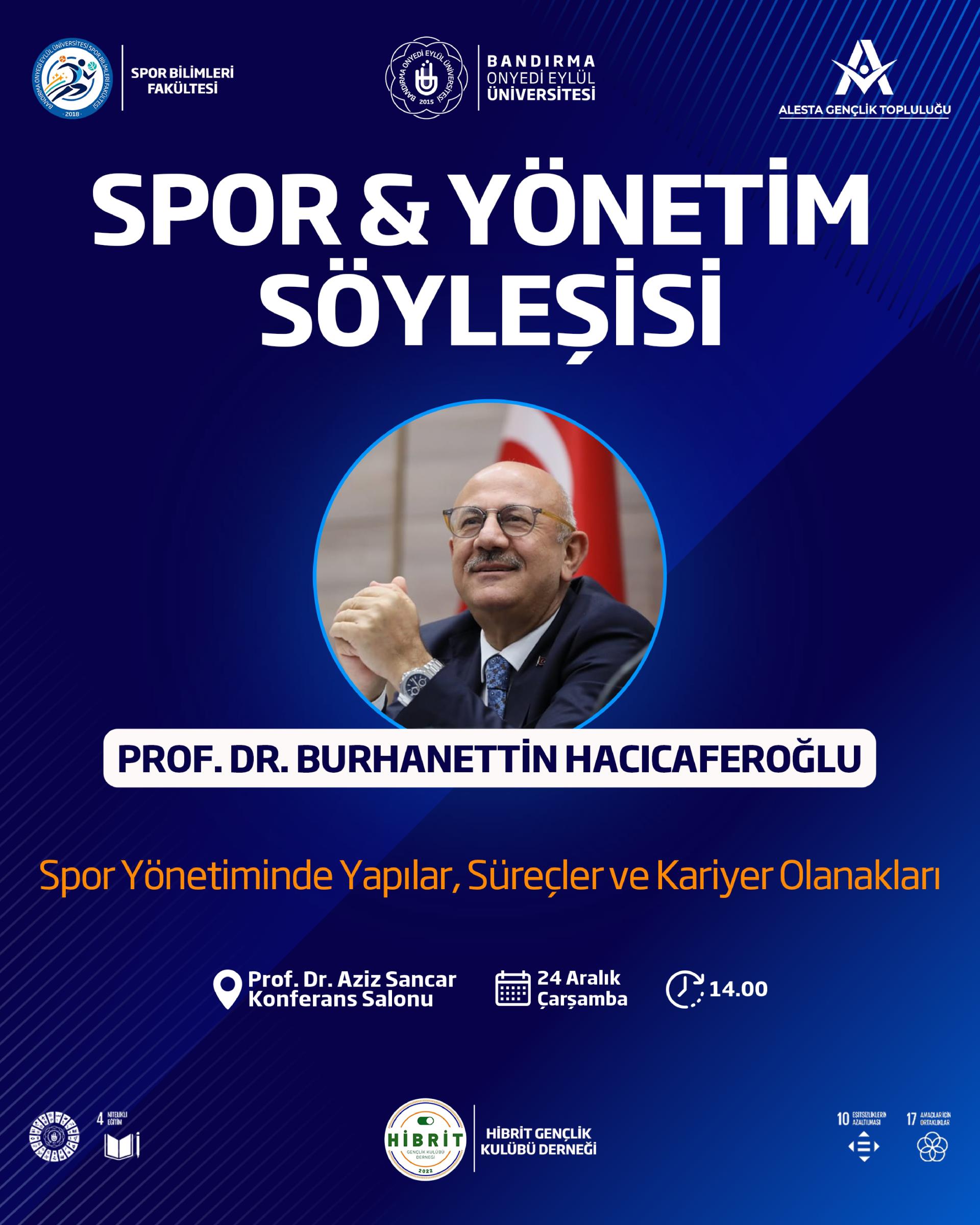 Fakültemiz, Kariyer Günleri etkinlikleri kapsamında 24 Aralık 2025 Çarşamba günü saat 14.00’te, “Spor ve Yönetim” başlıklı bir söyleşi düzenliyor. Söyleşi, Öğrenci Yaşam Merkezi Prof. Dr. Aziz Sancar Konferans Salonu’nda gerçekleştirilecektir.